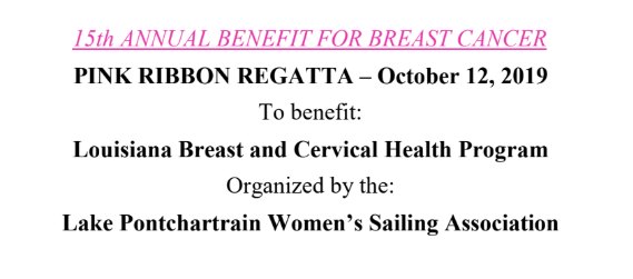 Get ready for the 15th Annual Pink Ribbon Regatta benefiting the Louisiana Breast and Cervical Health Program. For details or questions please contact this year’s organizers at lpwsa.events@gmail.com.