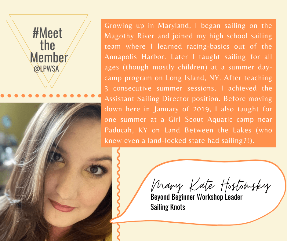 We are excited to have Mary Kate Hostomsky lead our first Beyond Beginner Workshop! Mary Kate reached out to LPWSA to offer a hands-on session about common sailing knots, a critical skill for every sailor. Join her and LPWSA members on September 17 at 6:30pm at the West End Park Pavilion in New Orleans, LA to learn and practice knot tying skills.