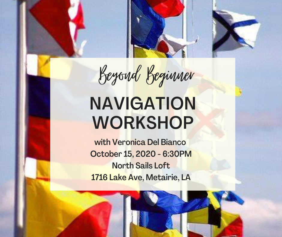 This month’s workshop, offered by Veronica Del Bianco, will focus on navigation skills for sailors. Participants will learn key navigation concepts and have an opportunity for hands-on practice with a chart, compass, and more! All supplies will be provided and light refreshments will be served! Join Veronica starting at 6:30pm on October 15 at North Sails Loft 1716 Lake Ave, Metairie, LA. All supplies will be provided.