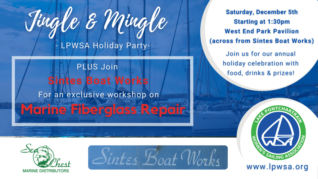 Join us for the annual LPWSA holiday party plus an exclusive workshop on fiberglass repair presented by Sintes Boat Works. The party starts at 1:30pm at the covered pavilion in West End Park. We will have food, drinks, prizes, and elections for your 2021 LPWSA board members. At 2pm we will walk across the street to Sintes Boat Works (7385 West Roadway Street) for a hands-on demonstration about marine fiberglass repair using our own club boat Femme Fatale. Please bring your own mask.