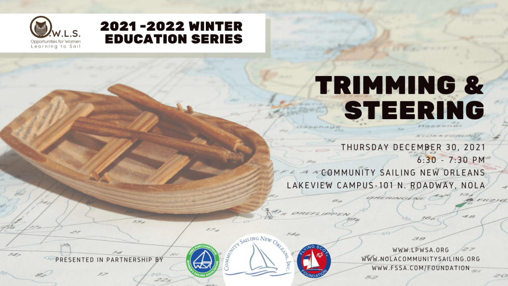 Knowing how to properly adjust a boat’s sails and steer for different conditions can make the difference between a fun sail and fail sail. In this class participants will learn the basics of how to trim sails for different wind directions as well as tips on steering to increase speed and maintain an enjoyable sail. Join us on Thursday, December 30 at 6:30pm at the Community Sailing New Orleans Lakeview Campus. Free, open to the public, and kid-friendly.